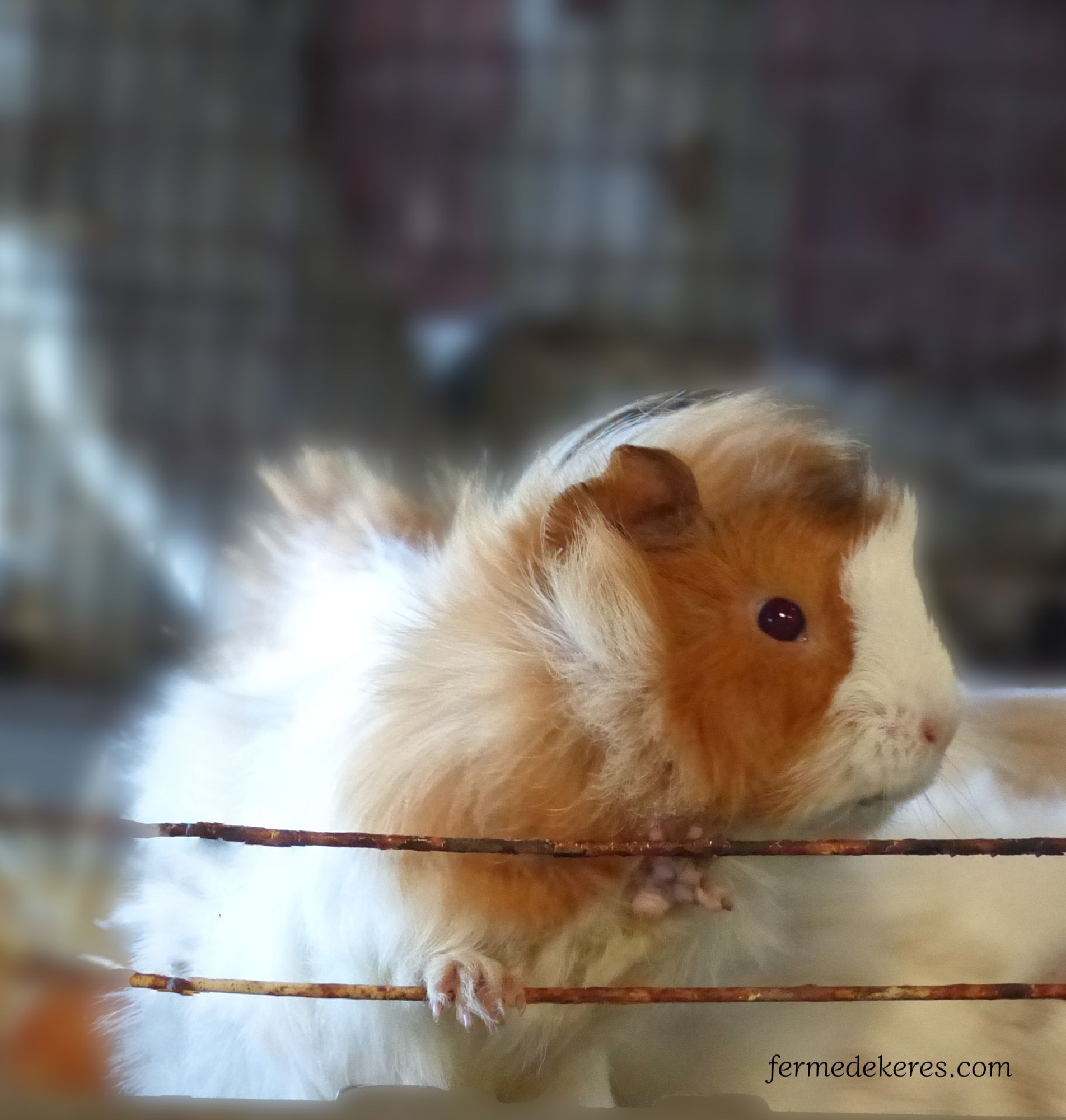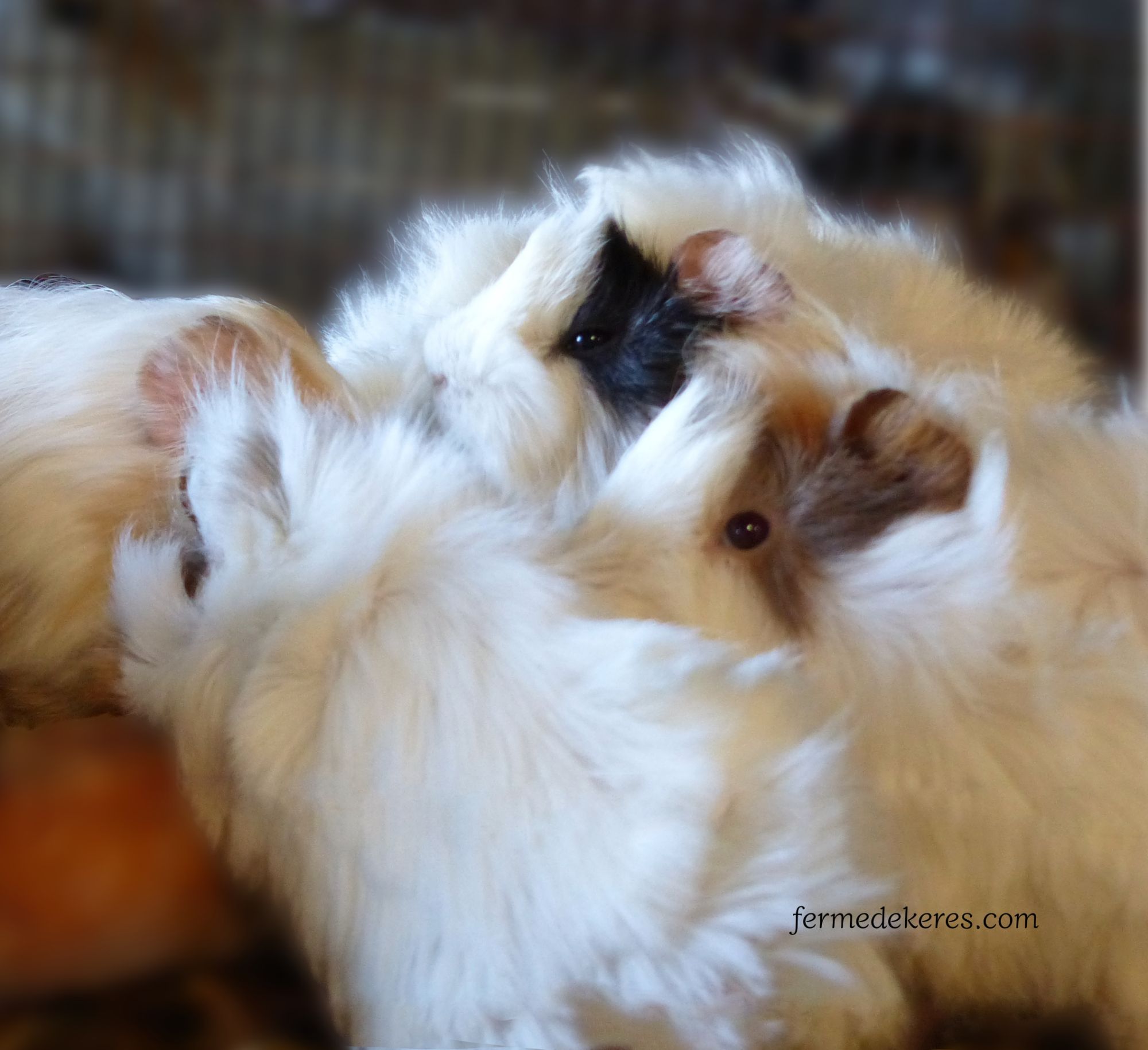 Les cochons d'inde de la ferme ne sont pas des cochons d'inde de race précise. Ce sont des mélanges, certains ont des rosettes ou des poils longs, d'autres ont un pelage normal, lisse. Ils sont élevés à l'année en extérieur sous abri et se nourrissent principalement de verdures que je leur cueille selon les saisons : herbe (la nourriture de base du cochon d'inde), plantes sauvages, choux et betteraves fourragers en hiver, etc… Ce sont des cochons d'inde rustiques qui peuvent aller directement en parc extérieur.